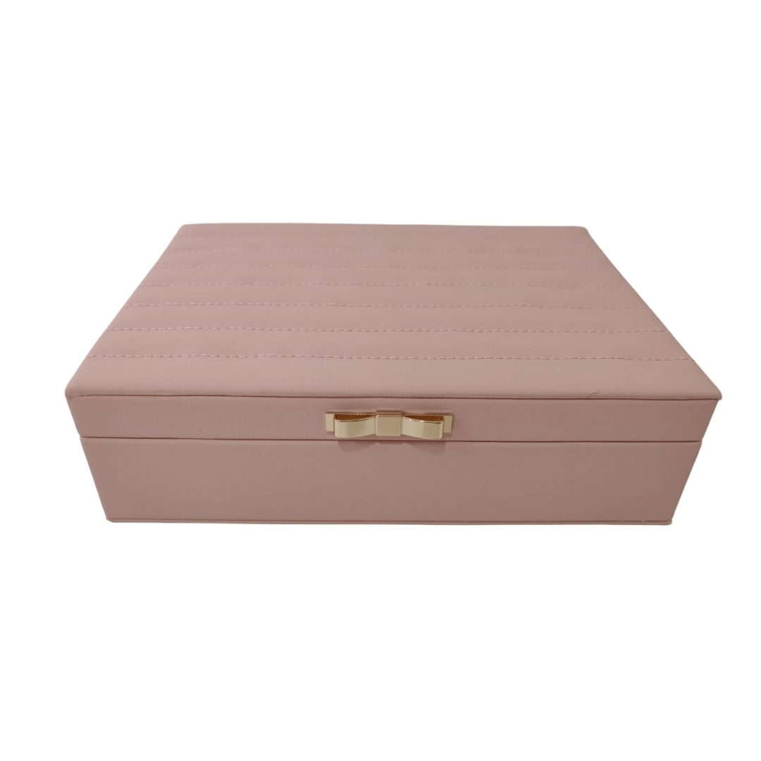 Organiza tus accesorios con estilo gracias a este joyero rectangular de un nivel para dama. Elegante, práctico y con compartimentos para anillos, collares y pulseras. Perfecto para cuidar tus joyas y tenerlas siempre a la mano.